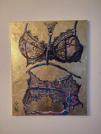 Die Figur trägt schwarze, transparente Dessous, die ihre weibliche Präsenz betonen, aber nie ins Vulgäre kippen. Vielmehr entsteht ein spannungsgeladener Kontrast zwischen Verletzlichkeit und Dominanz. Ihre Körperhaltung – eine Hand in die Hüfte gestemmt, die andere locker herabfallend – unterstreicht ihr Selbstbewusstsein. Feine Farbläufe und pastose Texturschichten scheinen ihre Haut zu durchziehen, was sie wie ein Wesen zwischen Traum und Realität wirken lässt.