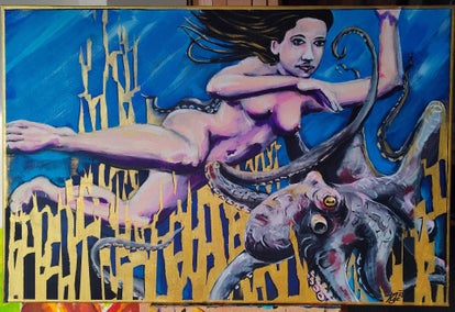 Das Bild „Deep immerse“ (tiefes eintauchen) ist ein beeindruckendes Kunstwerk, das eine unvergessliche Szene einfängt. Eine nackte Frau scheint in den tiefen Gewässern zu ertrinken, während ein Oktopus die Szenerie aufmerksam beobachtet. Doch während die Frau gleich schwerelos in der tiefe treibt, scheint eine Schildkröte in aller Ruhe und Gelassenheit die Gesamtsituation zu beobachten.
