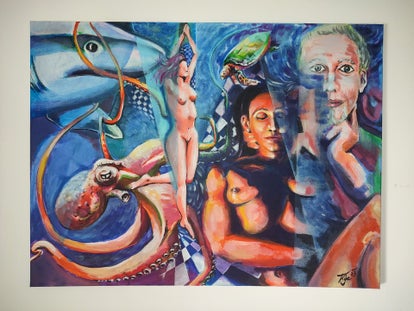 Dieses atemberaubende Kunstwerk mit dem Titel „Selfie time“ ist ein Meisterwerk in Acryl auf Leinwand, das in den Farben Blau, Grün, Lila und Hautfarben gehalten ist. Es zeigt eine nackte Schönheit, die sich über dem Boden schwebend räkelt und ein Selfie macht, während ein majestätischer Hai über ihr schwimmt. Der Boden ist in Einem Schachbrettmuster angelegt, welcher die verschiedenen Ebenen der Existenz symbolisiert.