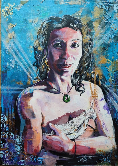 Das großformatige Gemälde „Fairy Temptations“ entfaltet seine Wirkung unmittelbar und lässt den Betrachter kaum los. Inmitten einer intensiven Farbkomposition steht eine selbstbewusste, sinnliche Frauenfigur im Zentrum – halb Fee, halb Verführerin. Ihre durchdringenden Augen ziehen den Blick magisch an, während ihre Haltung zwischen Stärke und Einladung oszilliert.