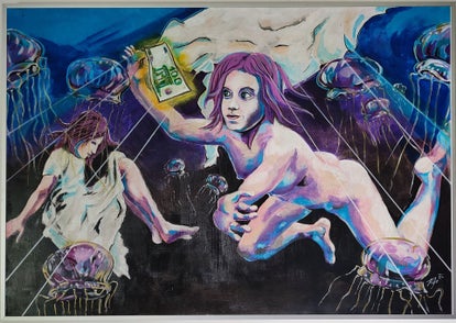 Das Bild „Lady Like and the Gender Shark“ stellt eine provokante und kraftvolle Aussage über die gegenwärtige Gesellschaft dar, insbesondere in Bezug auf die scheinheilige Natur der politischen Korrektheit. Das Bild zeigt eine Frau in Dessous, die als stereotype Verkörperung von Weiblichkeit dargestellt WIRD, während der Hai, der in abstrakten Bombenfarben mit einem Lächeln und menschlichen Zähnen dargestellt WIRD, das stereotype Bild des männlichen Raubtiers darstellt.